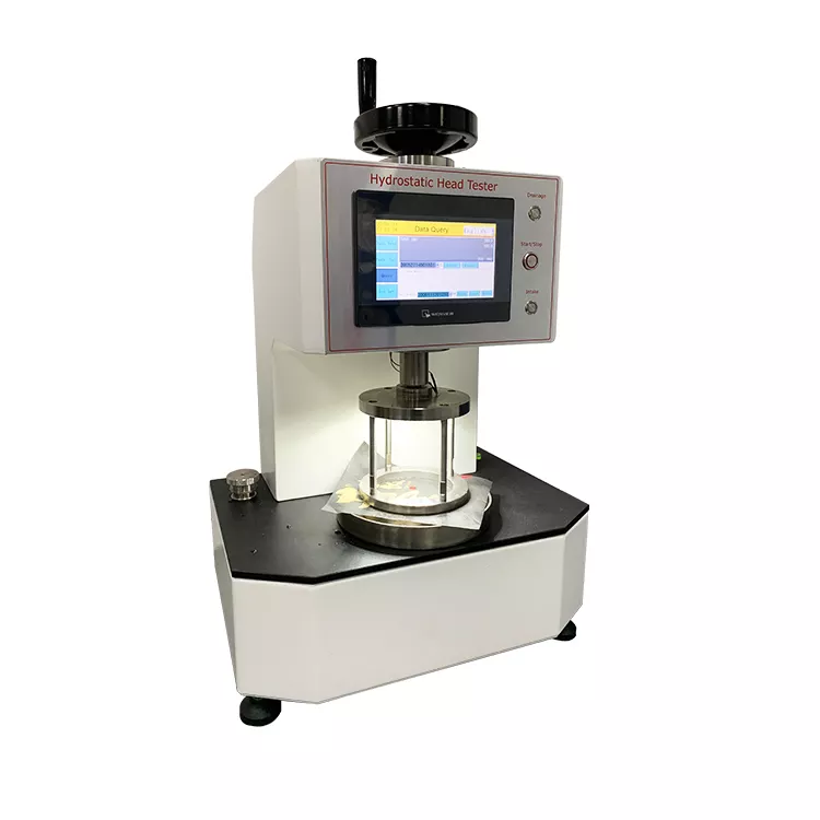 The Fabric Hydrostatic Head Pressure Test Machine is a tool used to test the waterproofness of fabrics. This machine applies pressure to a sample of the fabric being tested in order to simulate the effects of water on the material. The fabric is placed between two plates, with the bottom plate remaining stationary and the top plate moving down to apply pressure. A hydrostatic head is created by filling the space between the plates with water, and the pressure is measured to determine the fabric’s waterproofness. This test is commonly used in the water permeability of various fabrics that have undergone waterproof treatment. Such as canvas, coated fabric, covering cloth, rainproof clothing fabric, tarpaulin, tent cloth, and geotextile materials.