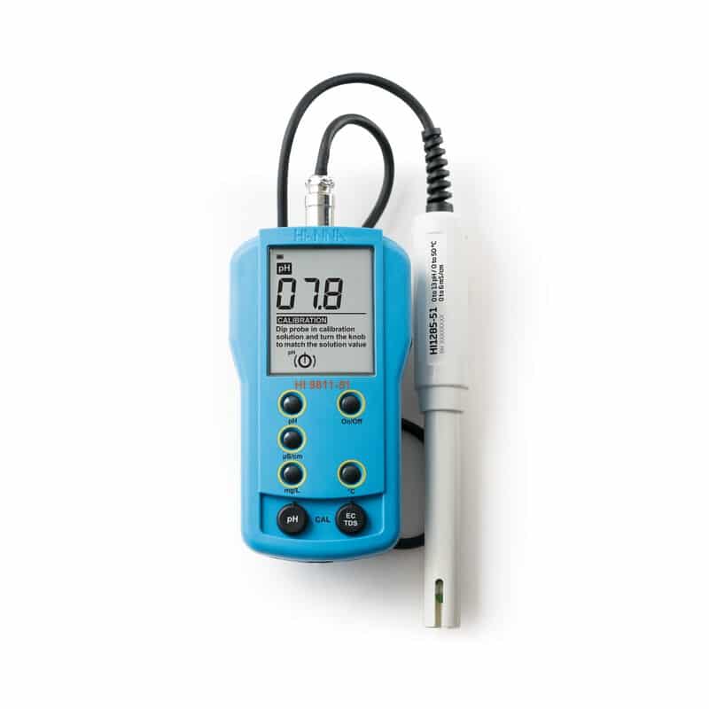 The Hanna Instruments HI 9811-5N is a waterproof multi-parameter meter for measuring electro-conductivity (EC), Total Dissolved Solids (TDS), pH, and temperature all in one device.